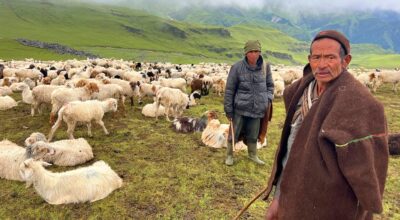१६ साउन, बागलुङ । अग्लो पहाडको शिरमा पुराना थाङ्नाले बेरिएको गोठ । निलो त्रिपाल र