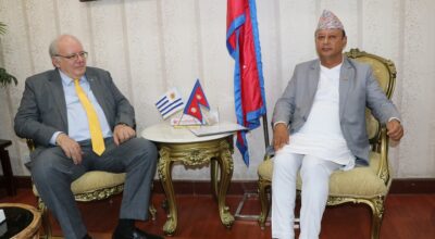 २० जेठ, काठमाडौँ । ऊर्जा, जलस्रोत तथा सिँचाइमन्त्री दीपक खड्कासँग नेपालका लागि उरुग्वेका गैरआवासीय राजदूत