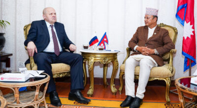 २० चैत, काठमाडौँ । ऊर्जा, जलस्रोत तथा सिँचाइमन्त्री दीपक खड्कासँग नेपालका लागि रसियाका राजदूत एलेक्सी