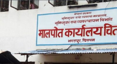 ७ चैत, चितवन । विसं २०७२ को भूकम्पमा रातो स्टिकर टाँसिएको मालपोत कार्यालय भरतपुरको भवन