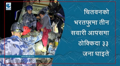 १४ कात्तिक, चितवन । गौरबाट काठमाडौँतर्फ गइरहेको बस भरतपुर महानगरपालिका–९ टिकौली जङ्गलमा आज बिहान दुर्घटना