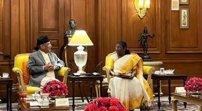 २८ जेठ, काठमाडौँ । भारतको औपचारिक भ्रमणमा रहेका प्रधानमन्त्री पुष्पकमल दाहाल ‘प्रचण्ड’ले राष्ट्रपति द्रौपदी मुर्मुसँग