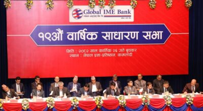 २७ कात्तिक, काठमाडौं । ग्लोबल आइएमई बैंकको १९ औँ वार्षिक साधारणसभा सम्पन्न भएको छ । बुधबार