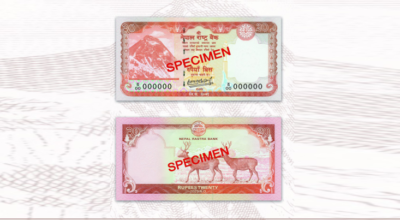 १९ असाेज, काठमाडाैं । नेपाल राष्ट्र बैंकले आज शुक्रबारदेखि २० रुपैयाँ दरको नयाँ नोट चलनचल्तीमा
