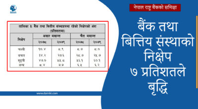 २७ वैशाख, काठमाडाैं । चालु आर्थिक वर्ष २०७९/८० को नौ महिनासम्म बैंक तथा वित्तीय संस्थाहरुको निक्षेप