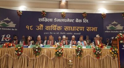 १७ चैत, काठमाडाैं । सांग्रिला डेभलपमेन्ट बैंक लिमिटेडकाे वार्षिक साधारण सम्पन्न भएकाे छ । बैंककाे