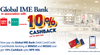 १७ जेठ, काठमाडाैं । ग्लोबल आइएमई बैंक लिमिटेडले आफ्ना ग्राहकहरुलाई मिनिसो र मिसियोका स्टोरहरूबाट सामान