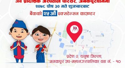 ३० पुस, काठमाडौँ । मेगा बैंक नेपाल लिमिटेडले धनुषाको जनकपुरधामस्थित प्रादेशिक अस्पतालमा एक्सटेन्सन काउन्टर विस्तार