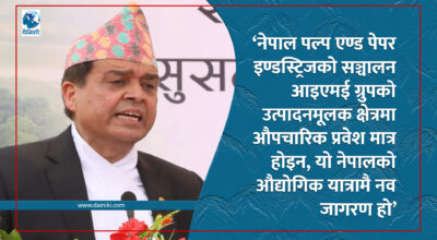२२ फागुन, महोत्तरी । आइएमई ग्रूपका अध्यक्ष चन्द्र प्रसाद ढकालले नेपाल पल्प एण्ड पेपर इण्डस्ट्रिजको