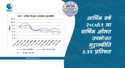 २ भदौ, काठमाडौँ । गत आर्थिक वर्ष २०८०/८१ को वार्षिक औसत मुद्रास्फीति पाँच दशमलव ४४