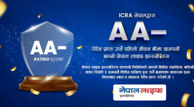 १२ कात्तिक, काठमाडाैं । नेपाल लाइफ इन्स्योरेन्स कम्पनीले इक्रा नेपालबाट ‘डबल ए माइनस रेटिङ’ प्राप्त