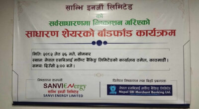 २५ जेठ, काठमाडौं । सान्भि इनर्जीको आइपीओ जेठ २६ गते सोमबार बाँडफाँड हुने भएको छ