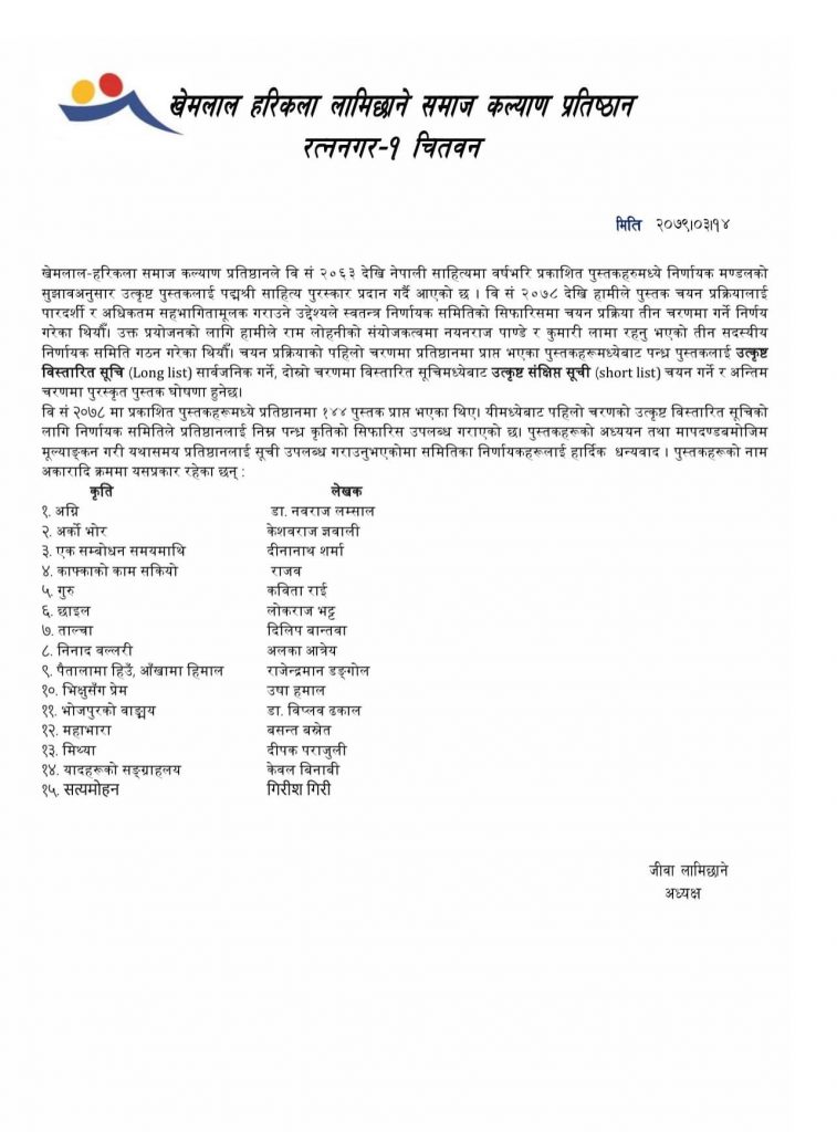 १५ असार, काठमाडौं । पद्मश्री साहित्य पुरस्कारका लागि प्राप्त पुस्तकमध्येबाट उत्कृष्ट १५ सूची घोषणा गरिएको छ । खेमलाल हरिकला लामिछाने समाज कल्याण प्रतिष्ठानले ०७८ मा प्रकाशित पुस्तकमध्ये प्रतिष्ठानलाई प्राप्त १४४ पुस्तकबाट पहिलो चरणमा १५ पुस्तक छनोट गरेको हो । दोस्रो चरणमा उत्कृष्ट संक्षिप्त सूची र अन्तिम चरणमा पुरस्कृत पुस्तक घोषणा हुने प्रतिष्ठानका अध्यक्ष जिवा लामिछानेले जानकारी दिए ।