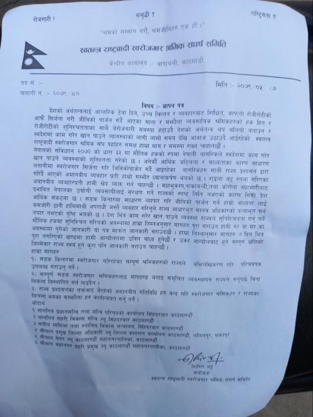 सडक किनारमा स्वरोजगार गरिरहेका सम्पूर्ण श्रमिकहरुको राज्यले अभिलेखिकरण गरि परिचयपत्र उपलब्ध गराउनुपर्ने, सम्पूर्ण सडक स्वरोजगार श्रमिकहरुलाई मापदण्ड बनाई समुचित व्यवस्थापन राज्यले गनुपर्छ, बिना विकल्प विस्थापित गर्न पाइँदैन र राज्य प्रशासनका तर्फबाट भइरहेका अमानवीय गतिविधिहरु बन्द गरि स्वरोजगार श्रमिक र राज्यका बीचमा भएका सम्झौताहरु कार्यान्वयन गर्नुपर्ने उनीहरुको माग छ ।
