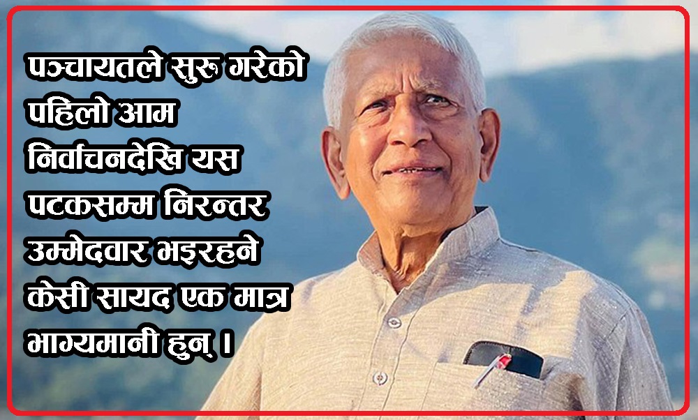 आउँदो ४ मंसिरमा हुँदै गरेको संघीय प्रतिनिधि सभाको निर्वाचनमा नुवाकोट क्षेत्र नं. २ का उम्मेदवार अर्जुननरसिंह केसीको पहिचान हो, यो । जो नेपाली कांग्रेसका केन्द्रीय सदस्य समेत हुन् । पञ्चायतले सुरु गरेको पहिलो आम निर्वाचनदेखि यस पटकसम्म निरन्तर उम्मेदवार भइरहने केसी सायद एक मात्र ‘भाग्यमानी’ हुन् ।