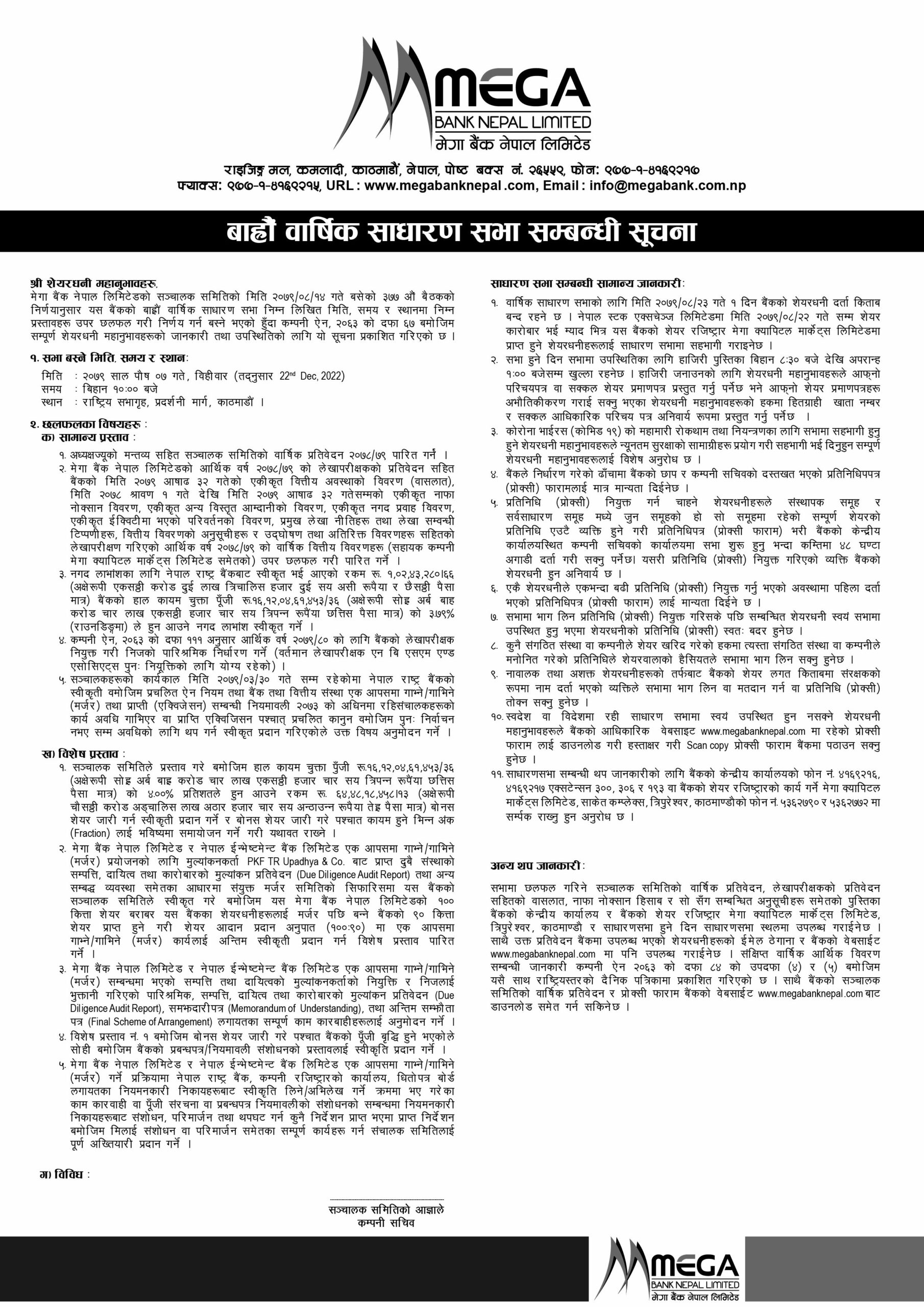 मेगा बैंककाे १२ औं वार्षिक साधारणसभा ७ पुसमा, यस्ता छन् प्रस्तावहरू