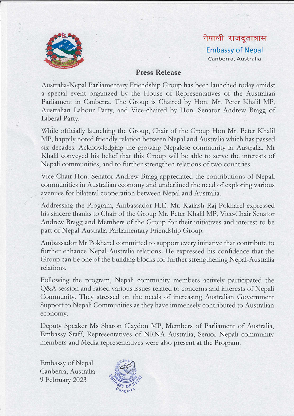 २६ माघ, अष्ट्रेलिया । अस्ट्रेलियाको संसदको प्रतिनिधि सभाले क्यानबेरामा आयोजना गरेको विशेष कार्यक्रमका बीच आज अस्ट्रेलिया–नेपाल संसदीय मैत्री समूहको सुरुवात भएको छ । समूहको अध्यक्षमा अस्ट्रेलियन लेबर पार्टीका सांसद पिटर खलिल र उपाध्यक्षमा अस्ट्रेलियन लेबर पार्टीका सांसद एन्ड्रयू ब्राग रहेका छन ।