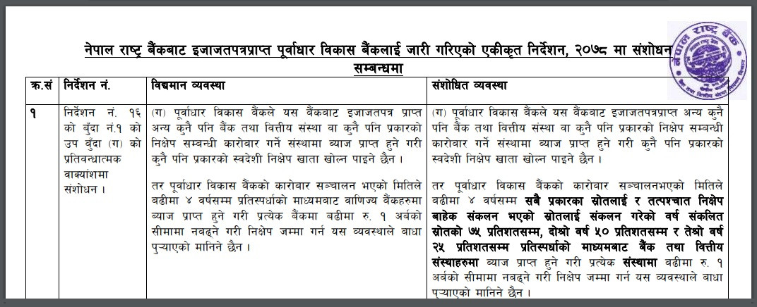 केन्द्रीय बैंकले पूर्वाधार विकास बैंकलाई जारी गरेको एकीकृत निर्देशन २०७८ मा संशोधन गर्दै यस्तो व्यवस्था गरेको हो । उक्त व्यवस्थाबाट इन्फ्रास्टक्चर डेभलपमेन्ट बैंक(निफ्रा) लगायतका पूर्वाधार विकास बैंकहरु लाभान्वित भएका छन् । अब निफ्राले पनि बढीमा ४ वर्षसम्म सबै प्रकारका स्रोतलाई र तत्पश्चात निक्षेप बाहेक संकलन भएको स्रोतलाई बैंक तथा वित्तीय संस्थाहरुमा ब्याज आउने गरी राख्न पाउनेछ ।