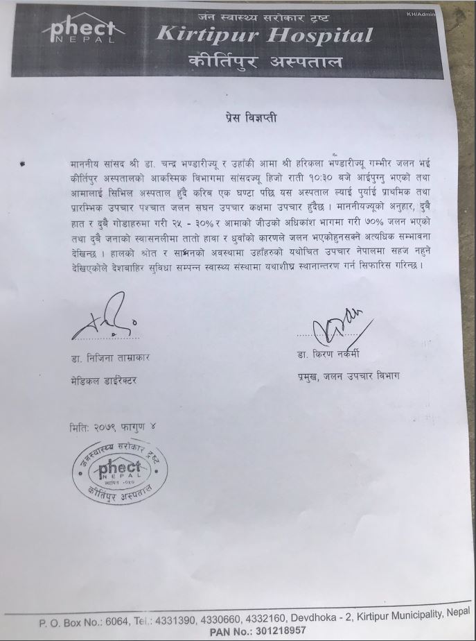 अस्पतालका जलन उपचार विभागका प्रमुख डा किरण नकर्मीका अनुसार नेता डा भण्डारीको अनुहार, दुवै हात र गोडामा २५–३० प्रतिशत तथा आमा हरिकलाको जीउको अधिकांश भाग गरी ७० प्रतिशत जलेको छ । डा भण्डारी र आमा हरिकलाको श्वासनलीमा तातो हावा र धुवाको कारणले जलन भएको हुनसक्ने अत्यधिक सम्भावना रहेको डा नकर्मीको भनाइ छ । नेपालमा भएको साधन र स्रोतले उपचार सम्भव नभएकाले देश बाहिर सुविधा सम्पन्न अस्पतालमा उपचार गर्न स्थानान्तरण (सिफारिस) गरिएको अस्पतालद्वारा जारी विज्ञप्तिमा उल्लेख छ ।