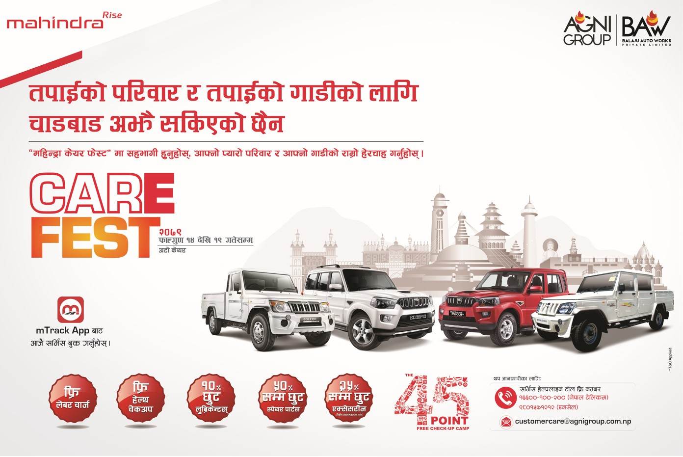 महिन्द्रा फोरव्हीलरको नेपालका लागि एक मात्र अधिकृत बिक्रेता अग्नि ग्रुपको सहायक कम्पनी बालाजु अटो वर्कशले यही फाल्गुन १४ गतेदेखि फाल्गुन १९ गतेसम्म देशव्यापी महिन्द्रा केयर फेस्ट आयोजना गर्दैछ । यस ४५–पोईन्ट चेकअप क्याम्पमा फ्रि लेबर चार्ज, फ्रि हेल्थ चेकअप, लुब्रिकेन्ट्समा १० प्रतिशत छुट र स्पेयर पार्टसमा ५० प्रतिशतसम्म छुट तथा एक्सेसरीजमा २५ प्रतिशत सम्म छुटको लाभ लिन सकिनेछ ।