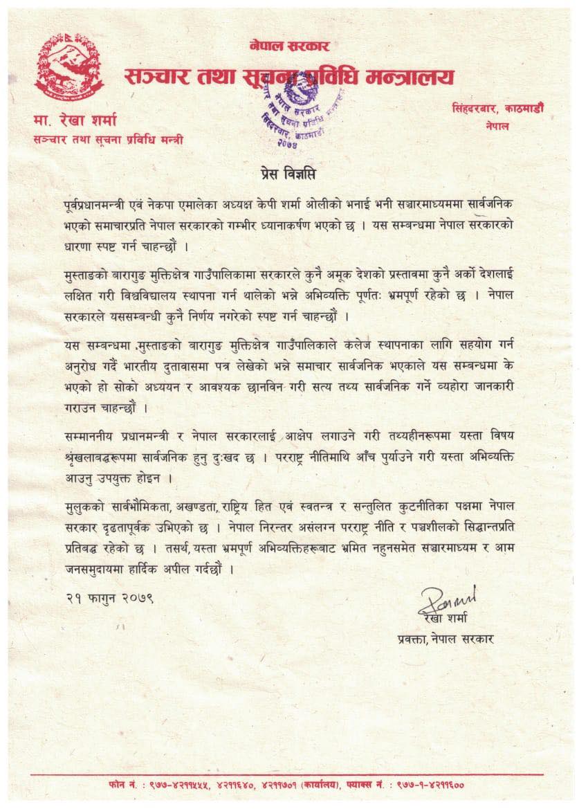 आइतबार विज्ञप्ति जारी गर्दै सरकार तर्फबाट सञ्चारमन्त्री रेखा शर्माले मुस्ताङको बारागुङ मुक्तिक्षेत्र गाउँपालिकाले कलेज स्थापनाका लागि सहयोग गर्न अनुरोध गर्दै भारतीय दुतावासमा पत्र लेखेको भन्ने समाचार सार्वजनिक भएकाले यस सम्बन्धमा के भएको हो सोको अध्ययन र आवश्यक छानविन गरी सत्य तथ्य सार्वजनिक गर्ने जानकारी दिएकी छिन ।