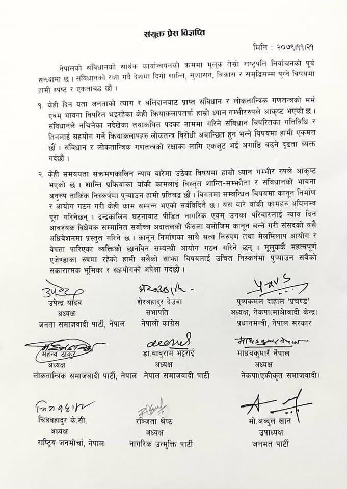 नौ दलको विज्ञप्तिमा भनिएको छ, ‘केही समययता संक्रमणकालिन न्याय वारेमा उठेका विषयमा हाम्रो ध्यान गम्भीर रुपले आकृष्ट भएको छ । शान्ति प्रक्रियाका बाँकी कामलाई विस्तृत शान्ति सम्झौता र संविधानको भावना अनुरूप तार्किक निस्कर्षमा पुयाउन हामी प्रतिवद्ध छौं । विगतमा सम्बन्धित विषयमा कानून निर्माण र आयोग गठन गरी केही काम सम्पन्न भएको सर्वविदितै छ । यस बारे बाकी कामहरु अविलम्ब पूरा गरिनेछन् । द्वन्द्वकालिन घटनाबाट पीडित नागरिक एवम् उनका परिवारलाई न्याय दिन आवश्यक विधेयक सम्मानित सर्वोच्च अदातलको फैसला बमोजिम कानून बन्ने गरी संसदको यसै अधिवेशनमा प्रस्तुत गरिने छ । कानून निर्माणका साथै सत्य निरुपण तथा मेलमिलाप आयोग र वेपत्ता पारिएका व्यक्तिको छानविन सम्बन्धी आयोग गठन गरिने छन् । मूलुककै महत्वपूर्ण एजेण्डाका रुपमा रहेको हामी सबैको साझा विषयलाई उचित निस्कर्षमा पुयाउन सबैको सकारात्मक भूमिका र सहयोगको अपेक्षा गर्दछौं ।’