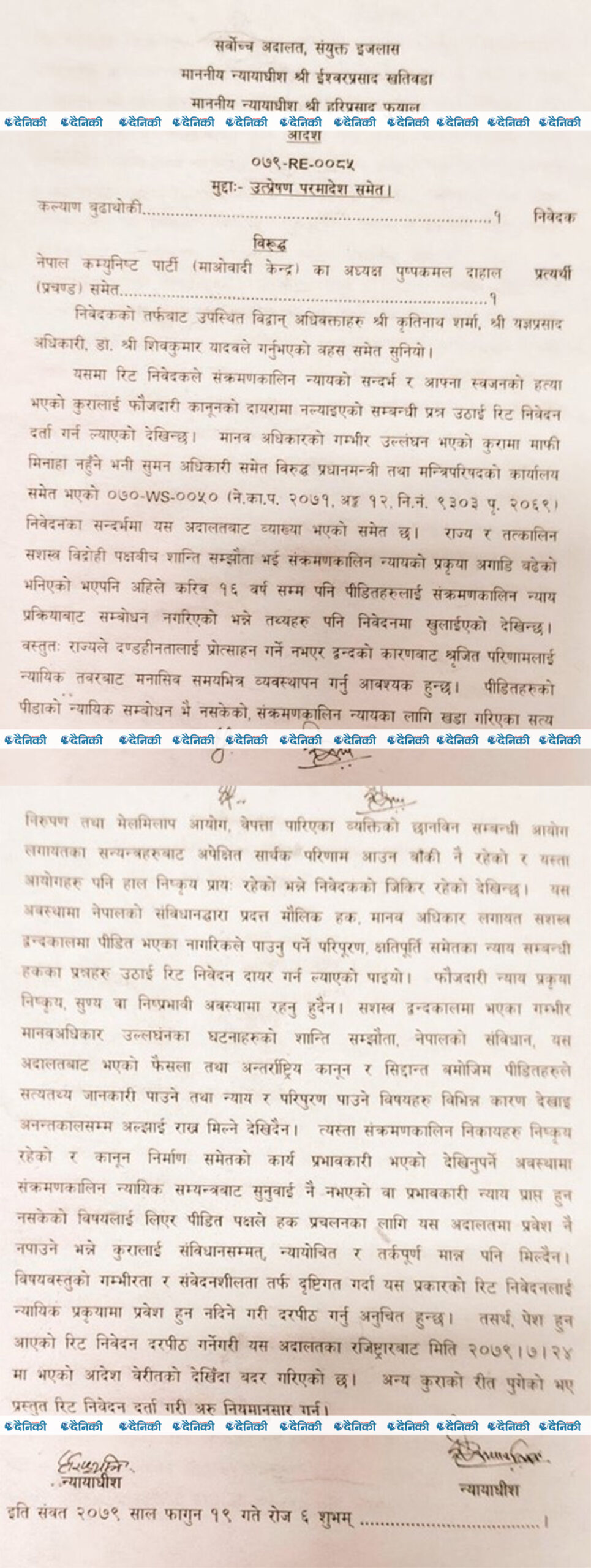 यसअघि सर्वोच्च प्रशासनले दरपिठ गरेको मुद्दामा सर्वोच्चले शुक्रबार आदेश दिँदै दरपिठको निर्णय बदर गरिदिएको थियो । शुक्रबार न्यायाधीशद्धय इश्वर खतिवडा र हरि फूयाँलको इजलाशले सर्वोच्च प्रशासनको निर्णय बदर गरिदिएको हो । प्रचण्डलाई हत्या आरोपमा पक्राउ गरी कारबाही गर्न माग गरिएको रिट दरपिठमा परेपछि कल्याण बुढाथोकी र अधिवक्ता ज्ञानेन्द्र आरणले छुट्टाछुट्टै दुईवटा निवेदन गत मंसिर ७ गते दिएका थिए । उक्त मुद्दमा तीन पटक तारेखमात्र तोकिएको थियो ।