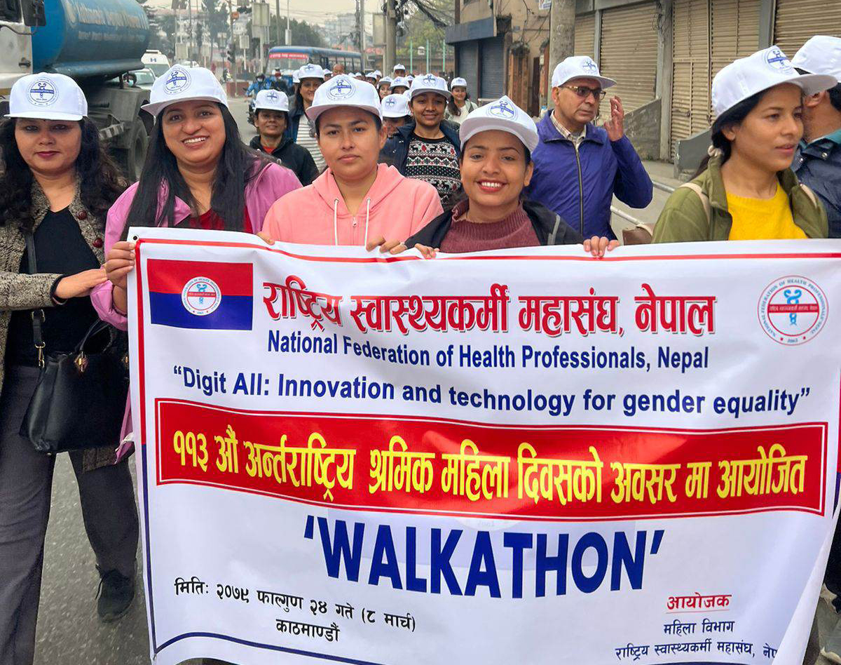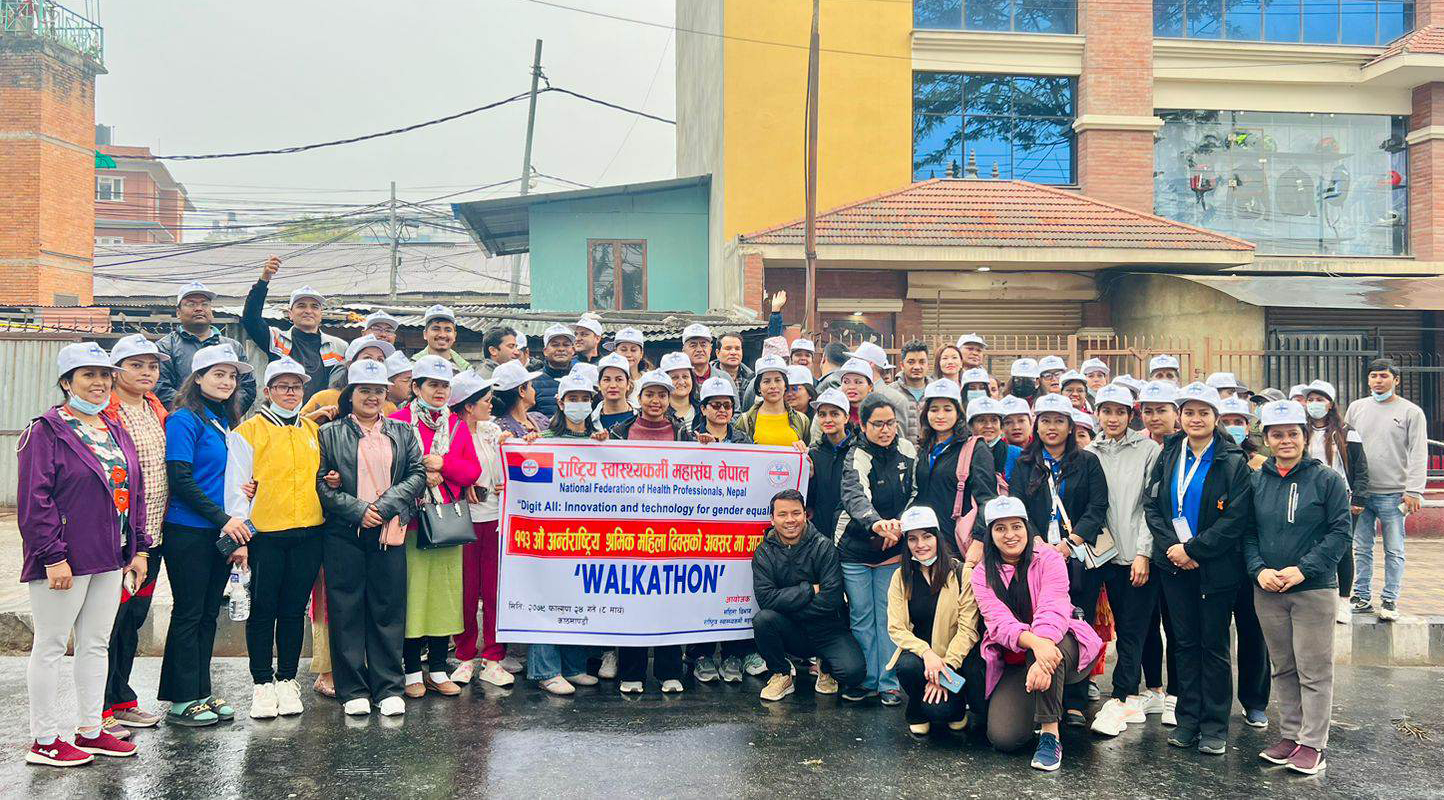 २४ फागुन, काठमाडाैँ । राष्ट्रिय स्वास्थ्यकर्मी महासंघ नेपालको आयोजनामा काठमाण्डौमा टेकुदेखि माईतिघर मण्डलासम्म वाकाथुन आयोजना गरिकोछ । वाकाथुनले महिलाहरुले घरको काम र व्यवस्थताको कारण स्वस्थ जिवन यापनको लागि समय अभाव हुने हुँदा दैनिक हिड्न जरुरी भएको र पुरूषको सहभागिता घरको कामममा समेत जरुरी भएको शन्देश प्रदान गरेको महासंघले जनाएको छ ।