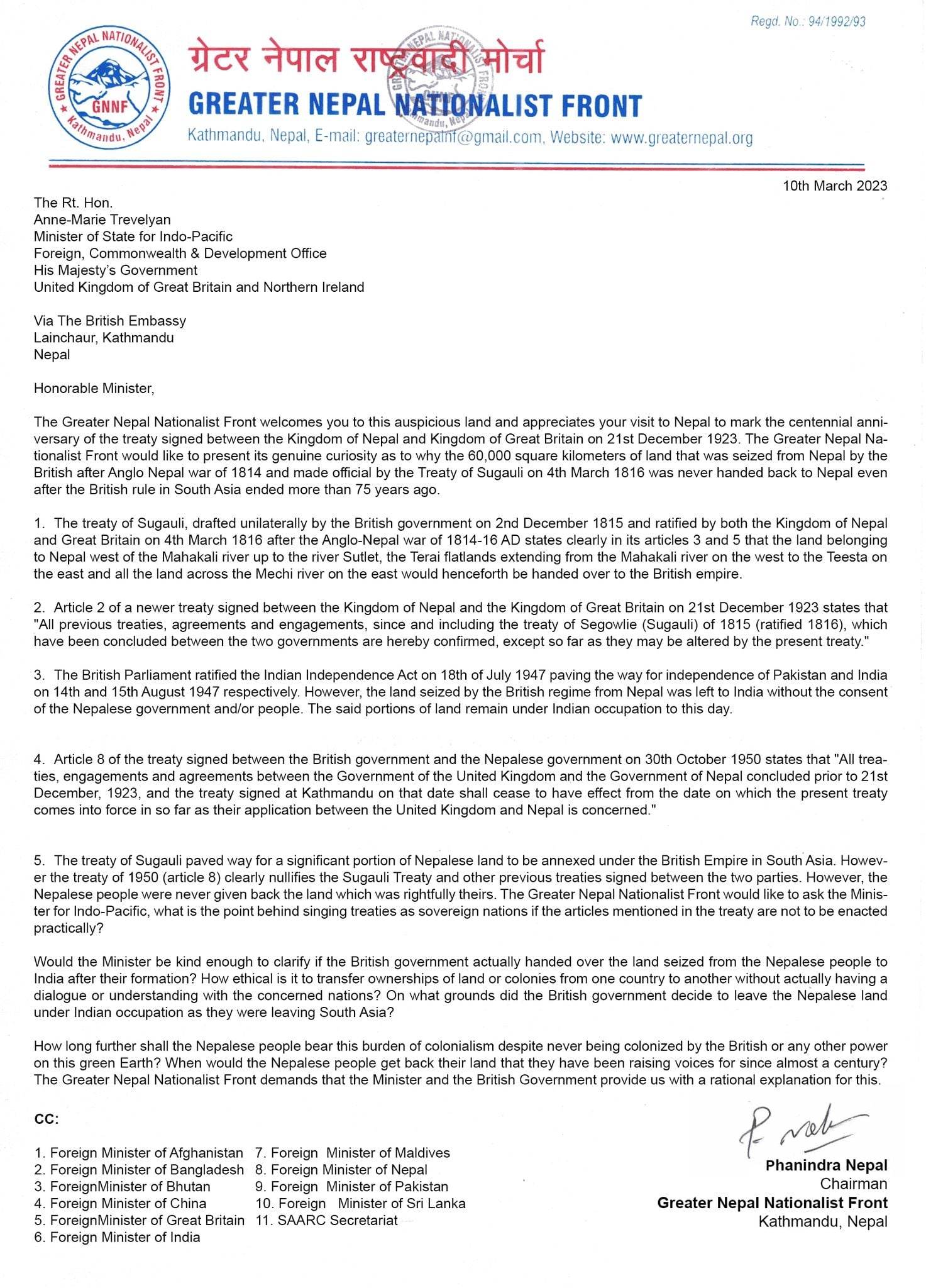 मोर्चाले भनेको छ, ‘ब्रिटेनले सुगौलीसन्धी हुँदै नेपाललाई हस्तान्तरण गरेको ६० हजार वर्ग किलोमिटर जमिन फिर्ता नगर्नुको कारण जान्न ग्रेटर नेपालका तर्फबाट राज्यमन्त्रीलाई आधा दर्जन प्रश्न सोधिएको छ र मोर्चाले सन्धिको शतवार्षिकीका अवसरमा नेपाल आएकी संयुक्त अधिराज्य ब्रिटेनकी परराष्ट्र मामिला तथा कमन वेल्थ राज्यमन्त्री अन्ने मेरी ट्रेभेल्यानलाई पाँच बुँदे पत्र पठाएको छ ।’