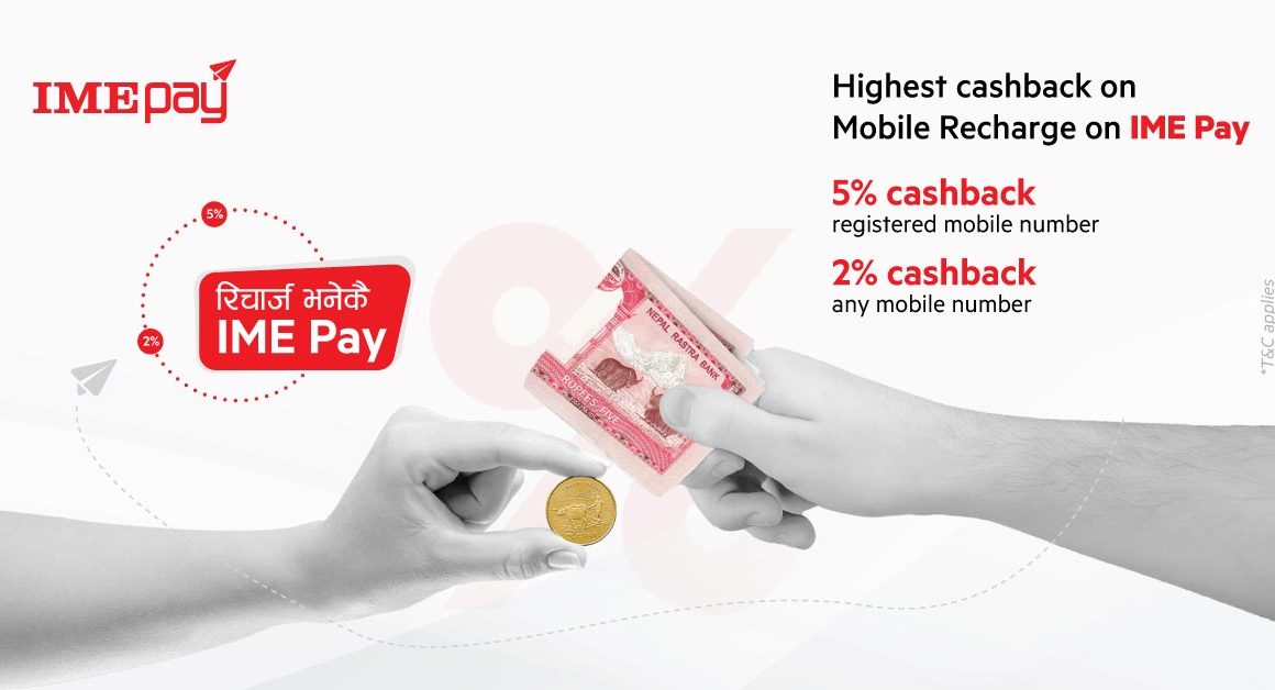 २८ फागुन, काठमाडाैं । आइएमई ग्रुपद्वारा सञ्चालित आइएमई डिजिटल सोलुसन लिमिटेडद्वारा प्रवर्द्घित ‘आइएमई पे’ ले आफ्नो सेवाग्राहीलाई आइएमई पे मोबाइल वालेटमार्फत गरिने रिचार्जमा ५ प्रतिशत क्यासब्याकको अफर यथावत राखेको छ।