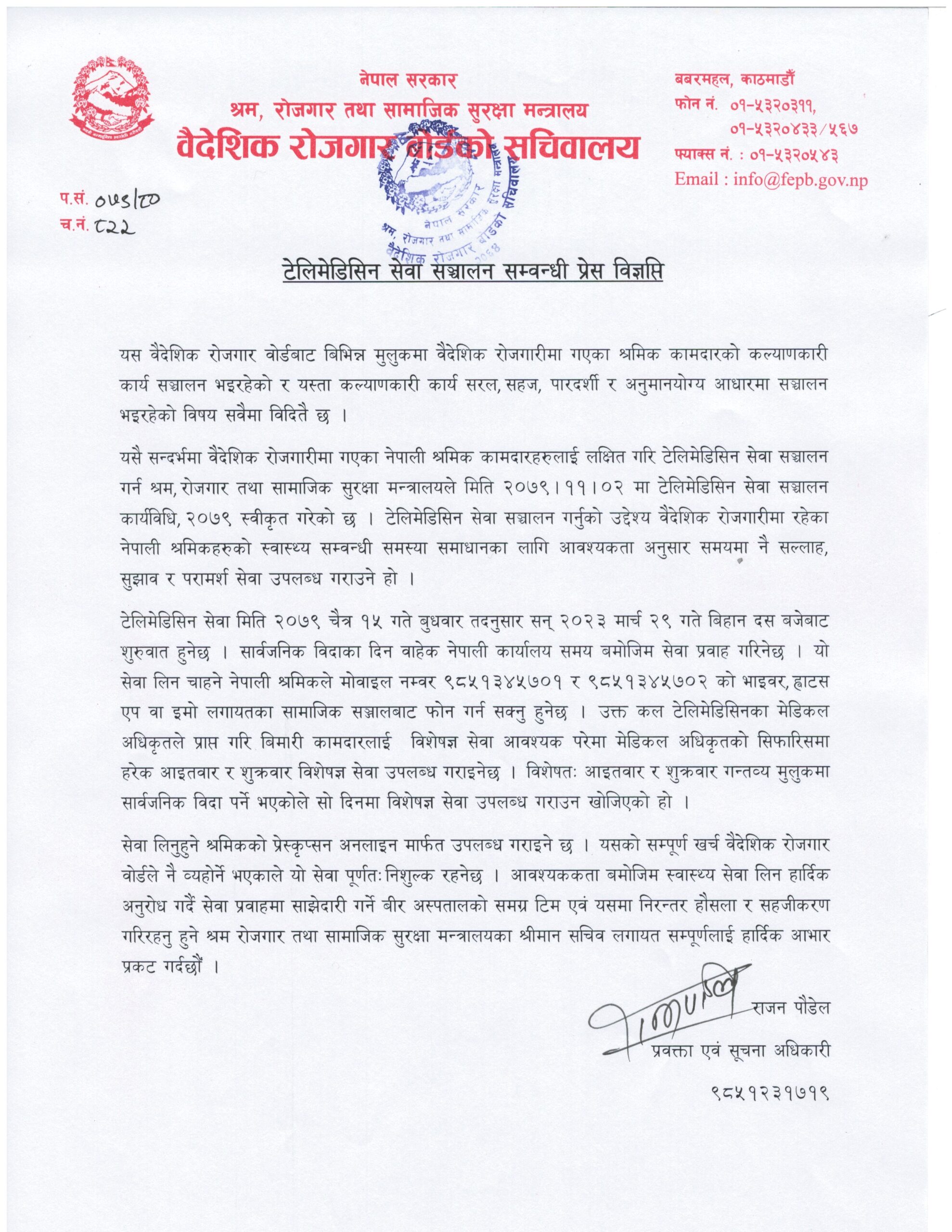 कार्यालय समयमा सेवाग्राहीले भाइवर, ह्वाट्स एम वा इमोमार्फत सम्पर्क गर्न सक्नेछन् । यसका लागि हामीले सम्पर्क नम्वर पनि सार्वजनिक गरेका छौं । सेवा बीर अस्पतालबाट प्रवाह हुनेछ ।’ बोर्डका अनुसार प्रत्येक वर्ष बैदेशिक रोजगारमा गएका १२ हजार ५ सय श्रमिकको बिभिन्न स्वास्थ्य समस्याका कारण मृत्यू हुने गरेको छ ।