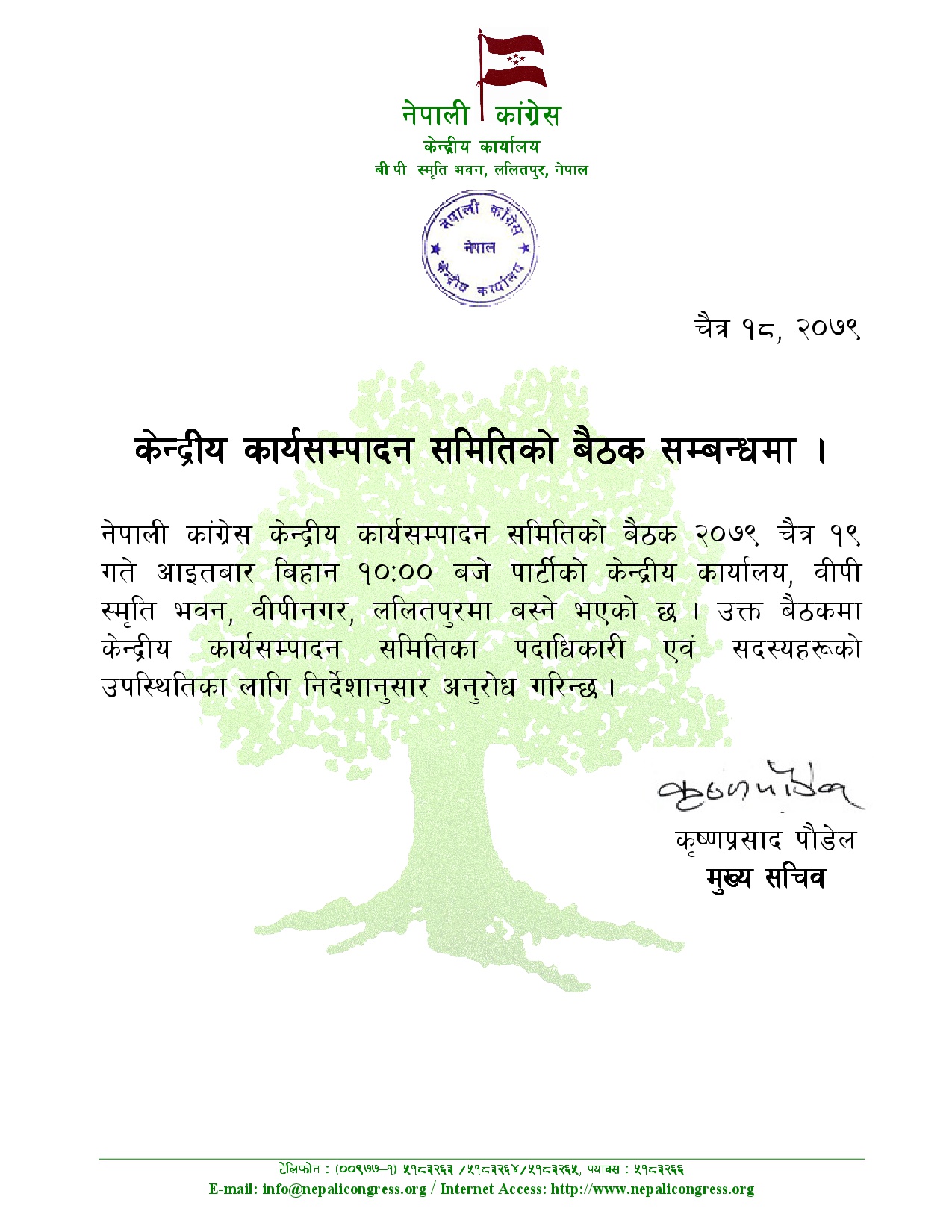 उनको सूचनामा भनिएको छ, ‘नेपाली कांग्रेस केन्द्रीय कार्यसम्पादन समितिको बैठक २०७९ चैत्र १९ गते आइतबार बिहान १०ः०० बजे पार्टीको केन्द्रीय कार्यालय, वीपी स्मृति भवन, वीपीनगर, ललितपुरमा बस्ने भएको छ । उक्त बैठकमा केन्द्रीय कार्यसम्पादन समितिका पदाधिकारी एवं सदस्यहरूको उपस्थितिका लागि निर्देशानुसार अनुरोध गरिन्छ ।’