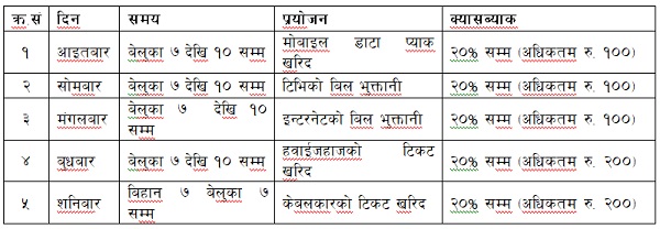 बैंकले मोबाइल बैंकिङ एप्लिकेसन– ग्लोबल स्मार्ट प्लस गरिने भुक्तानी प्रक्रियालाई प्रवर्द्धन गर्नका लागि यो क्यासब्याक योजना सार्वजनिक गरेको हो।