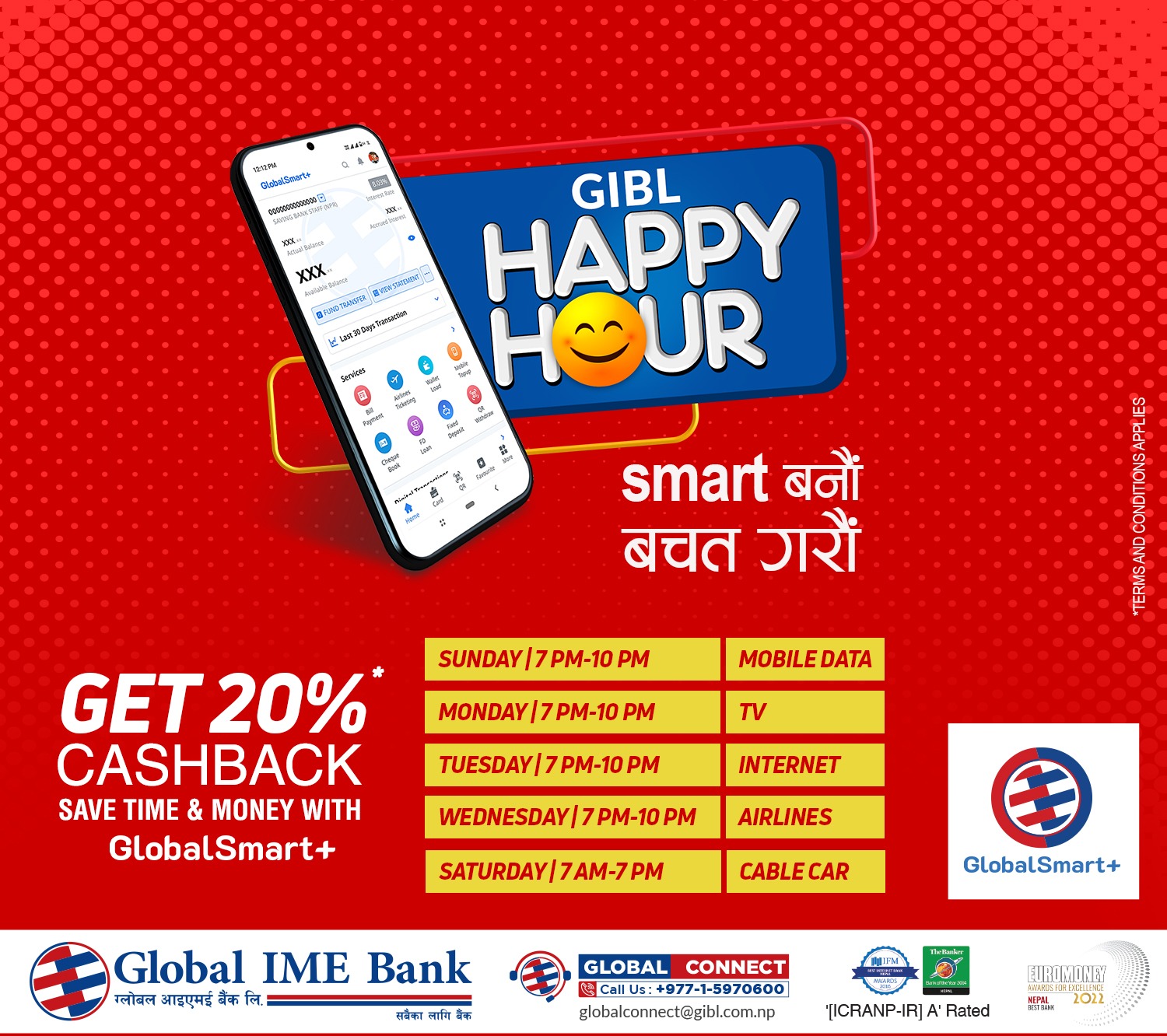 १९ चैत, काठमाडाैं । ग्लोबल आइएमई बैंक लिमिटेडले आफ्ना ग्राहकका लागि ‘ह्याप्पी आवर्स’ योजना सार्वजनिक गरेको छ। यो योजनाअन्र्तगत बैंकका ग्राहकले ग्लोबल स्मार्ट प्लसबाट अनलाइन भुक्तानी गर्दा खरिदको २० प्रतिशतसम्म क्यासब्याक पाउनेछन्।