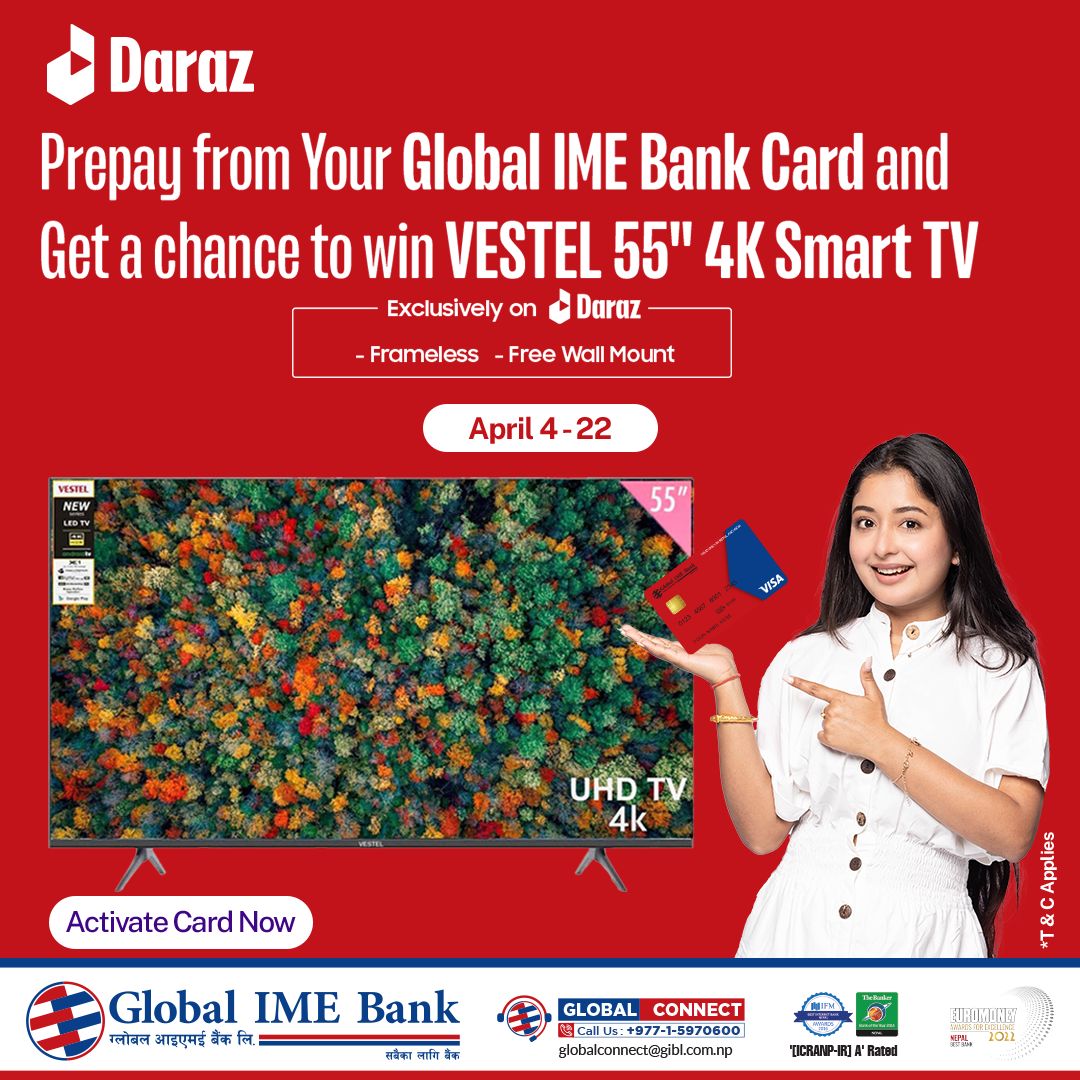 २२ चैत, काठमाडाैं । ग्लोबल आइएमई बैंक लिमिटेडले आफ्ना ग्राहकहरुका लागि दराजबाट सामान किन्दा ५५ इञ्च वेस्तेल लिड स्मार्ट टिभी जित्नसक्ने योजना सार्वजनिक गरेको छ ।