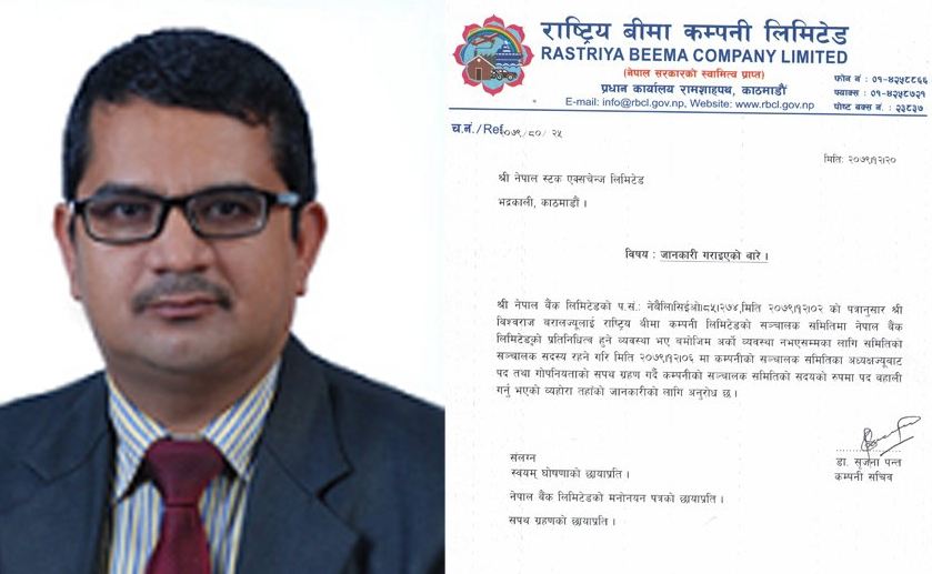 बैंकको प्रतिनिधित्व हुने व्यवस्था भएबमोजिम अर्को व्यवस्था नभएसम्मका लागि समितिको संचालक सदस्य रहने गरी चैत ६ गते कम्पनीको संचालक समितिको अध्यक्षबाट पद तथा गोपनियताको सपथ ग्रहण गरी पद बहाली गरेका छन् ।