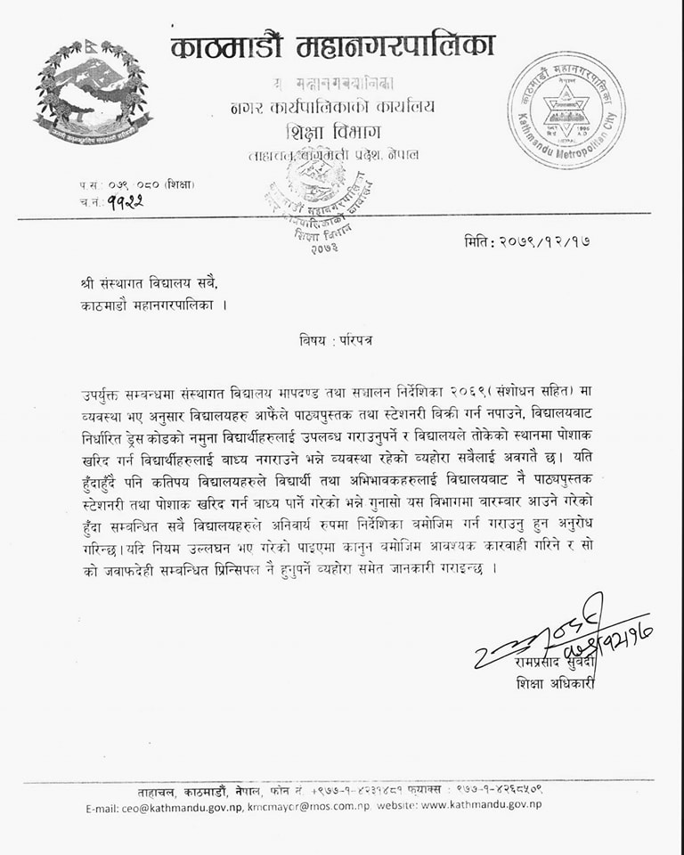 २६ चैत, काठमाडौँ । काठमाडौँ महानगरपालिकाले पुस्तक र पोशकको व्यापार गरे विद्यालायलाई कडा कारबाही गर्ने चेतावनी दिएको छ । महानगरका प्रमुख बालेन्द्र साहको निर्देशनमा शिक्षा शाखाले सम्पूर्ण विद्यालयमा परिपत्र नै गरेर पुस्तक र पोशाकको व्यापार गरे कडा कारबाही गर्ने चेतावनी दिएको हो । परिपत्रमा तोकिएकै ठाउँबाट किताब तथा विद्यालय पोशाक खरिद गर्न बाध्य पार्ने विद्यालयलाई कारबाही गर्ने बताइएको छ ।