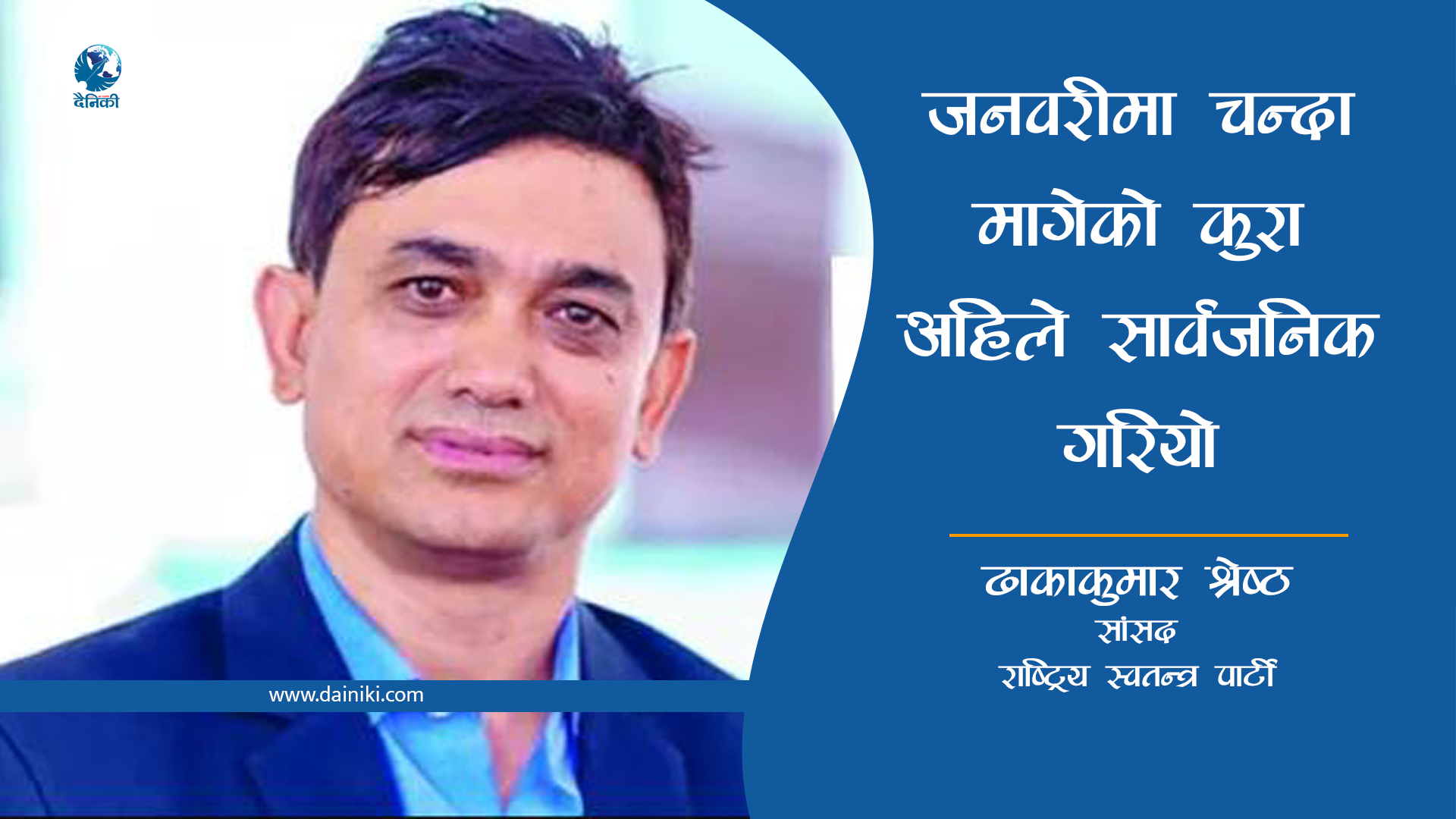 २९ चैत, काठमाडाैँ । राष्ट्रिय स्वतन्त्र पार्टी (रास्वपा) का सांसद ढाकाकुमार श्रेष्ठले सभापति रवि लामिछानेकाे कोर टिमलाई बुझाउन जनवरीमा दुई कराेड मागेको स्वीकार गरेका छन । उनले जनवारीमा चन्दा मागेको कुरा अहिले सार्वजनिक भएको भन्दै आपत्ति जनाए । बुधबार पत्रकार सम्मेलन गर्दै उनले अहिले चुनावको मुखमा उक्त चन्दाको अडियो सार्वजनिक हुँदा समस्या भएको बताए । अडियो संवादको व्यहोरामा कुनै आपत्ति नजाइ श्रेष्ठले जनवरीको अडियो अहिले सार्वजनिक भएकोमामात्र दुःख प्रकट गरे ।