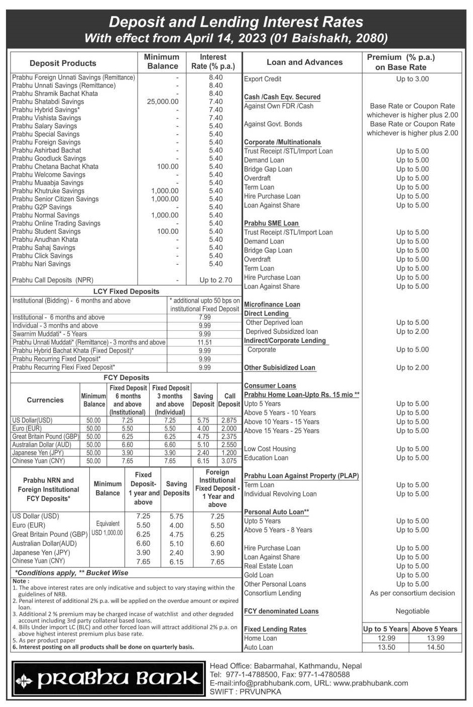 बैंकले बचत खातामा न्यूनतम ५.४० प्रतिशतदेखि अधिकतम ८.४० प्रतिशतसम्म ब्याज दिनेछ । बैंकको मुद्दति निक्षेपको ब्याज न्यूनतम ७.९९ प्रतिशत देखि अधिकतम ११.५१ प्रतिशतसम्म तोकिएको बैंकले सार्वजनिक गरेको नयाँ व्याजदरमा उल्लेख छ । साथै, बैंकले रेमिट्यान्स मुद्दती खातामा १०.९९ प्रतिशत र प्रभु उन्नति मुद्दति(रेमिट्यान्स) खातामा ११.५१ प्रतिशत ब्याज दिने भएकाे छ । बचत खातामा न्यूनतम ६ प्रतिशतबाट घटाएर ५.४० प्रतिशतमा ब्याजदर कायम गरेकाे बैंकले जनाएकाे छ ।