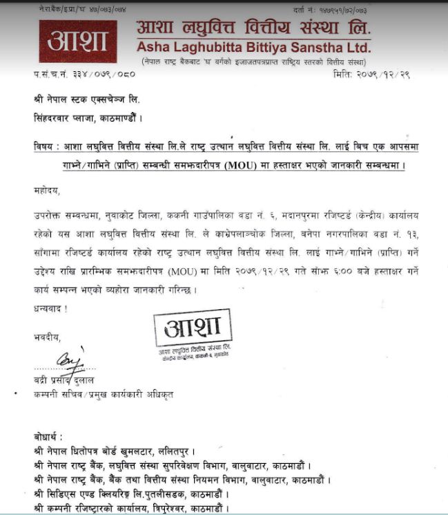 आशा लघुवित्तका प्रमुख कार्यकारी अधिकृत बद्रीप्रसाद दुलालका अनुसार दुवै संस्थाका सञ्चालक समितिका अधिकारीहरुबीच प्राप्ति सम्बन्धी सहमतिमा हस्ताक्षर भएको हो ।