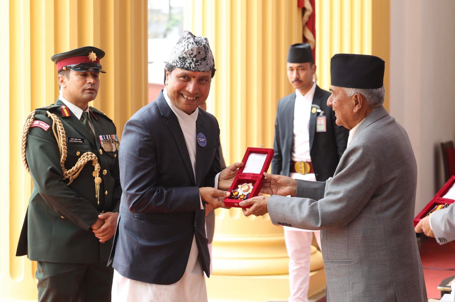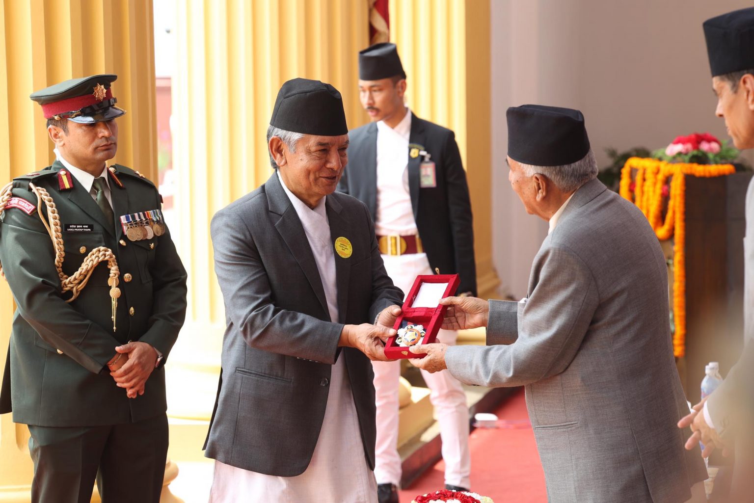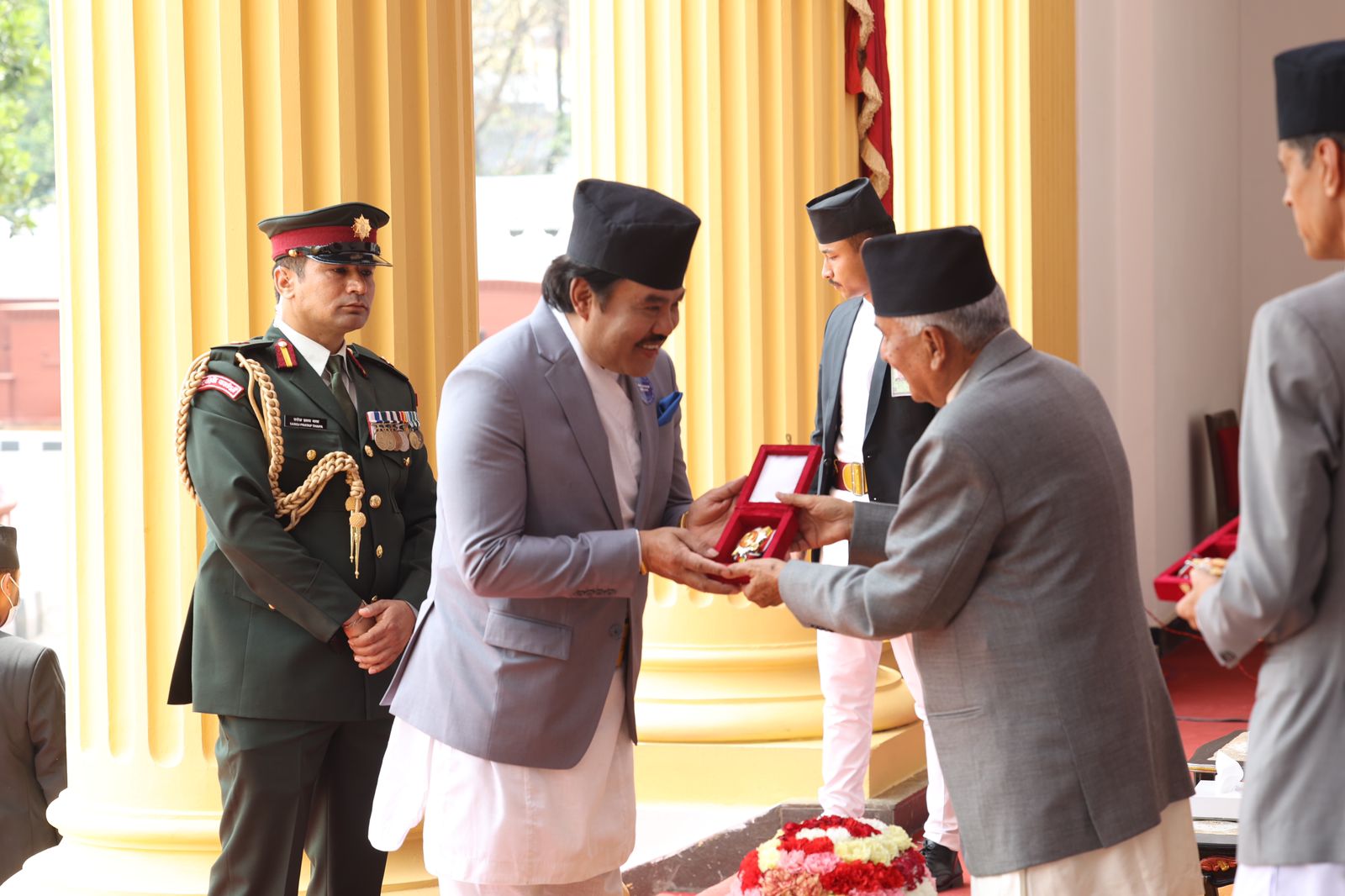 १ वैशाख, काठमाडाैं । राष्ट्रपति रामचन्द्र पौडेलले विभिन्न क्षेत्रमा योगदान पुर्याएका व्यक्तिहरूलाई विभूषण प्रदान गरेका छन्। असोज ३ गते संविधान दिवसका दिन घोषित विभूषण आज प्रदान गरेका हुन्।