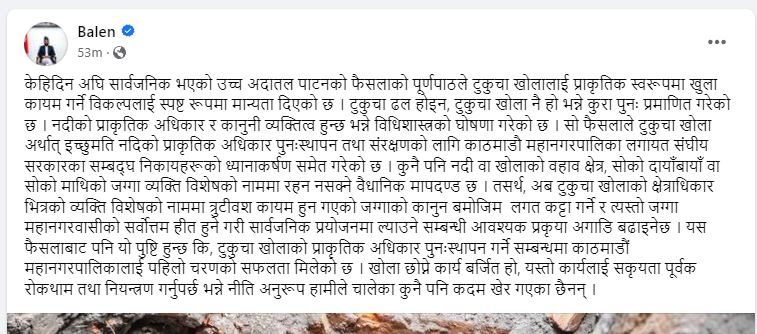 केहिदिन अघि सार्वजनिक भएकाे उच्च अदातल पाटनकाे फैसलाकाे पूर्णपाठले टुकुचा खाेलालाई प्राकृतिक स्वरूपमा खुला कायम गर्ने विकल्पलाई स्पष्ट रूपमा मान्यता दिएकाे छ । टुकुचा ढल हाेइन, टुकुचा खाेला नै हाे भन्ने कुरा पुनः प्रमाणित गरेकाे छ । नदीकाे प्राकृतिक अधिकार र कानुनी व्यक्तित्व हुन्छ भन्ने विधिशास्त्रकाे घाेषणा गरेकाे छ । साे फैसलाले टुकुचा खाेला अर्थात् इच्छुमति नदिकाे प्राकृतिक अधिकार पुनःस्थापन तथा संरक्षणको लागि काठमाडौ महानगरपालिका लगायत संघीय सरकारका सम्बद्घ निकायहरूकाे ध्यानाकर्षण समेत गरेकाे छ । कुनै पनि नदी वा खाेलाकाे वहाव क्षेत्र, साेकाे दायाँबायाँ वा साेकाे माथिकाे जग्गा व्यक्ति विशेषकाे नाममा रहन नसक्ने वैधानिक मापदण्ड छ । तसर्थ, अब टुकुचा खाेलाकाे क्षेत्राधिकार भित्रकाे व्यक्ति विशेषकाे नाममा त्रुटीवश कायम हुन गएकाे जग्गाको कानुन बमाेजिम लगत कट्टा गर्ने र त्यस्ताे जग्गा महानगरवासीकाे सर्वाेत्तम हीत हुने गरी सार्वजनिक प्रयाेजनमा ल्याउने सम्बन्धी आवश्यक प्रकृया अगाडि बढाइनेछ । यस फैसलाबाट पनि याे पुष्टि हुन्छ कि, टुकुचा खाेलाकाे प्राकृतिक अधिकार पुनःस्थापन गर्ने सम्बन्धमा काठमाडौं महानगरपालिकालाई पहिलाे चरणकाे सफलता मिलेकाे छ । खाेला छाेप्ने कार्य बर्जित हाे, यस्ताे कार्यलाई सकृयता पूर्वक राेकथाम तथा नियन्त्रण गर्नुपर्छ भन्ने नीति अनुरूप हामीले चालेका कुनै पनि कदम खेर गएका छैनन् ।