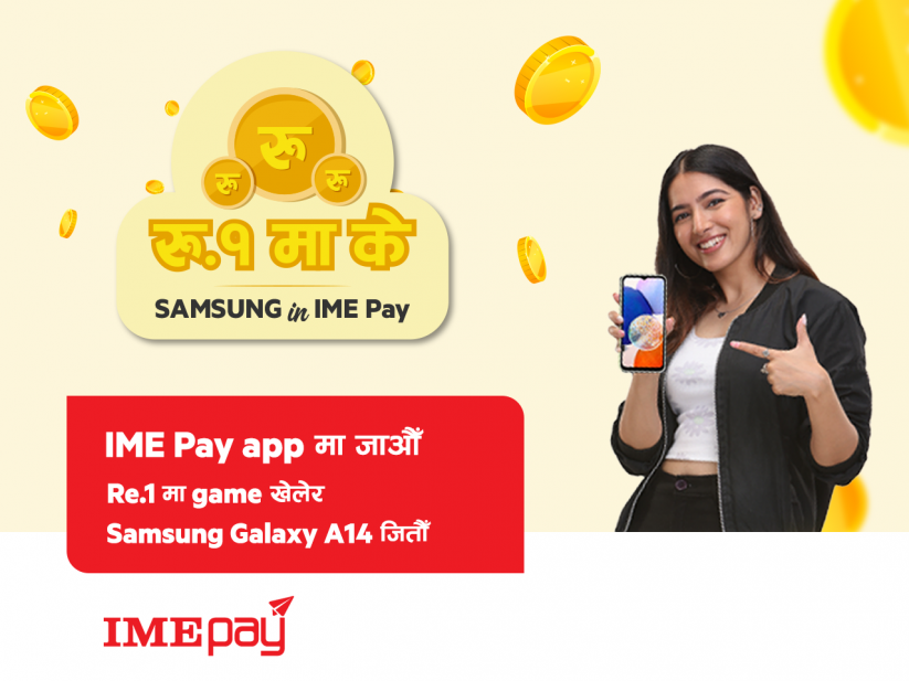 ११ जेठ, काठमाडाैं । आइएमई पे ले ‘रु. १ मा के, सामसुङ इन आइएमई पे’ नामक खेल आफ्नो एपमा सार्वजनिक गरेको छ। जेठ १० गतेदेखि जेठ १७ गतेसम्म चल्ने यस अफरमा आइएमई पेका सम्पूर्ण प्रयोगकर्ताले केवल रु. १ मा सो खेल खेली सामसुङको ग्यालेक्सी ए–१४ ५जी स्मार्टफोन जित्ने मौका पाउन सक्नेछन्।