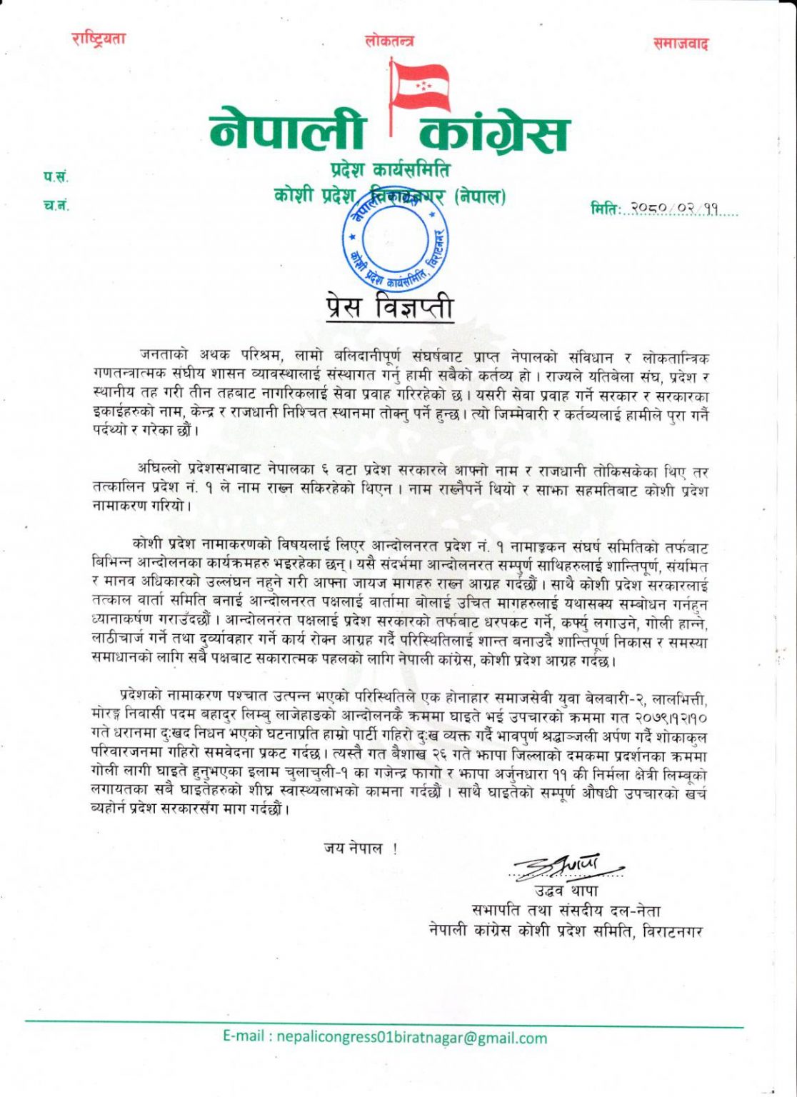 साझा सहमतिबाटै कोशी प्रदेश नामाकरण गरिएको कांग्रेसको दावी