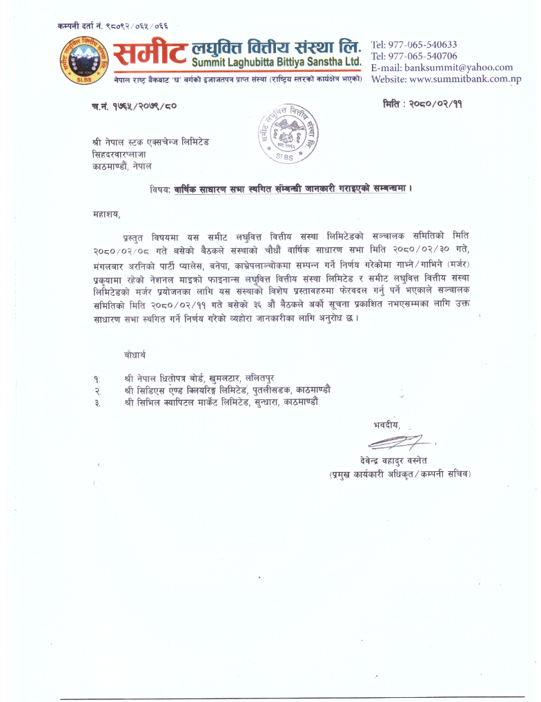 मर्जर प्रक्रियामा रहेको नेशनल माइक्रोफाइनान्स लघुवित्त र समिट लघुवित्तको साधारण सभाको विशेष प्रस्तावमा केही फेरबदल गर्नुपर्ने भएकाले आफ्नो वार्षिक साधारण सभा केही समयको लागि स्थगित गरेको कम्पनीले जनाएको छ ।