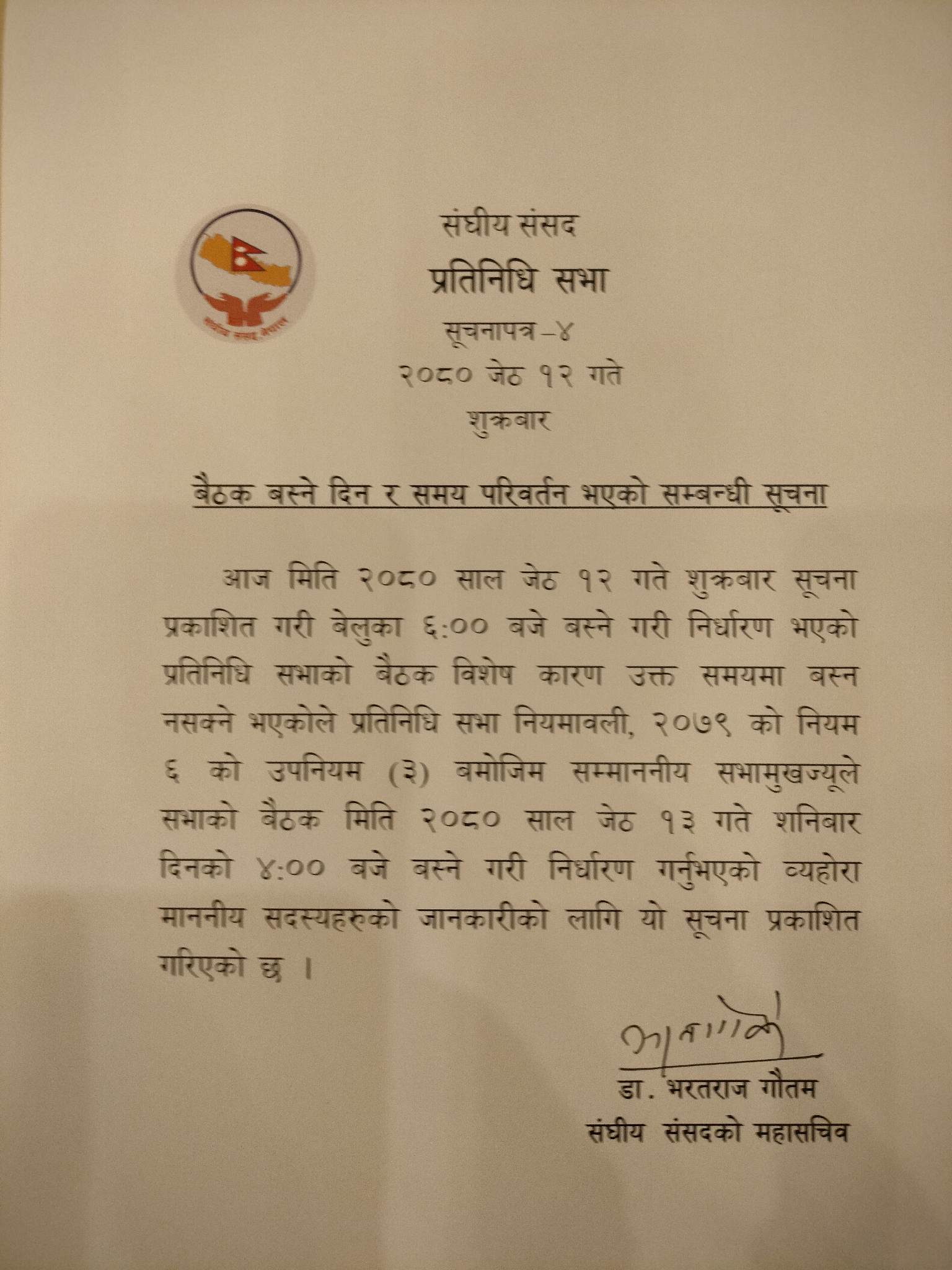 १२ जेठ, काठमाडाैँ । नेकपा एमालेको अबरोधपछि रोकिएको प्रतिनिधिसभाको बैठक भोलि शनिबार दिउँसो ४ बजेसम्मका लागि स्थगित भएको छ । संसद सचिवालयका महासचिव भरतराज गाैतमले सूचना निकालेर शनिबार दिउँसो ४ बजे बैठक बस्ने जानकारी दिएका छन ।
