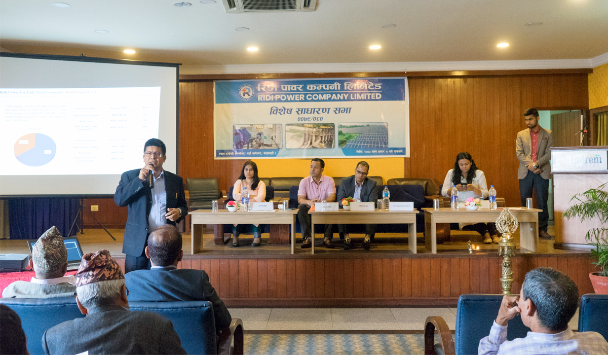 विशेष साधारणसभालाई सम्बोधन गर्दै रिडी पावरका अध्यक्ष संजिव न्यौपानेले सेयरधनीहरुको उच्च प्रतिफलका लागि आफूहरु लागि रहने बताए । त्यसै गरी सभामा कम्पनीका प्रबन्ध निर्देशक कुबेरमणि नेपालले २० मेगावाट क्षमताको तल्लो बलेफी खोला जलविद्युत आयोजनाको बारेमा सेयरधनीलाई प्रष्ट पारेका थिए ।