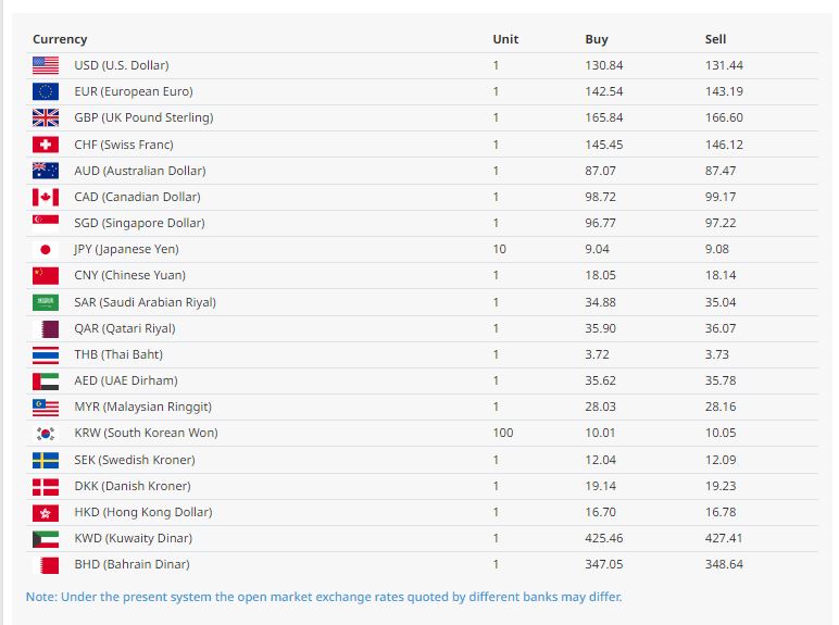 १९ असार, काठमाडाैं । नेपाल राष्ट्र बैंकले आज असार १९ गते मंगलबारका लागि विदेशी मुद्राको विनिमय दर सार्वजनिक गरेको छ। राष्ट्र बैंकका अनुसार आज अमेरिकी डलर एकको खरिद दर १३० रुपैयाँ ८४ पैसा र बिक्री दर १३१ रुपैयाँ ४४ पैसा रहेको छ।