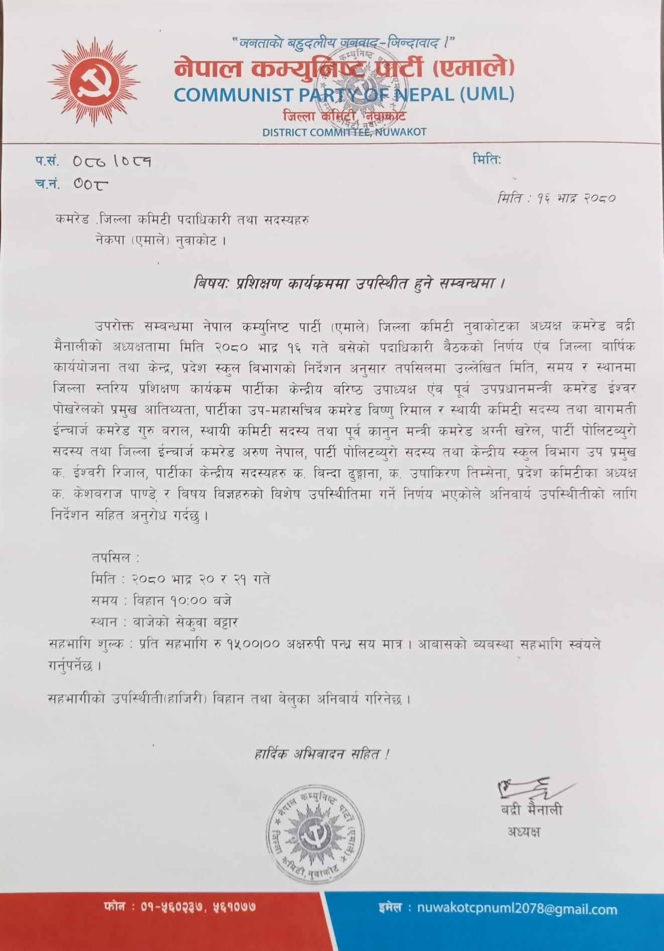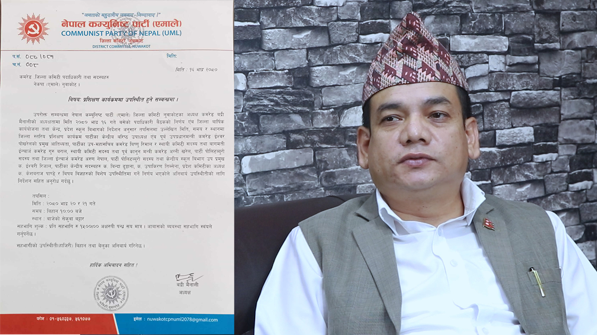दुई दिने कार्यक्रममा कार्यकर्ताले १५ सय रूपैयाँ तिरे पनि बेलुकीको खाना र बासको व्यवस्था भने आफैँ गर्नुपर्ने एमाले नुवाकोटका अध्यक्ष बद्री मैनालीले निमन्त्रणा मार्फत जानकारी दिएका छन । झण्डै दुई सय जनाको अबैध जिल्ला कमिटीका सदस्य एकै ठाउँमा राखेर गरिने प्रशिक्षणमा नेताले के सिकाउलान र कार्यकर्ताले के सुनेर के सिक्लान भन्ने प्रश्न पनि उत्तिकै टड्कारो रूपमा उठेको छ ।