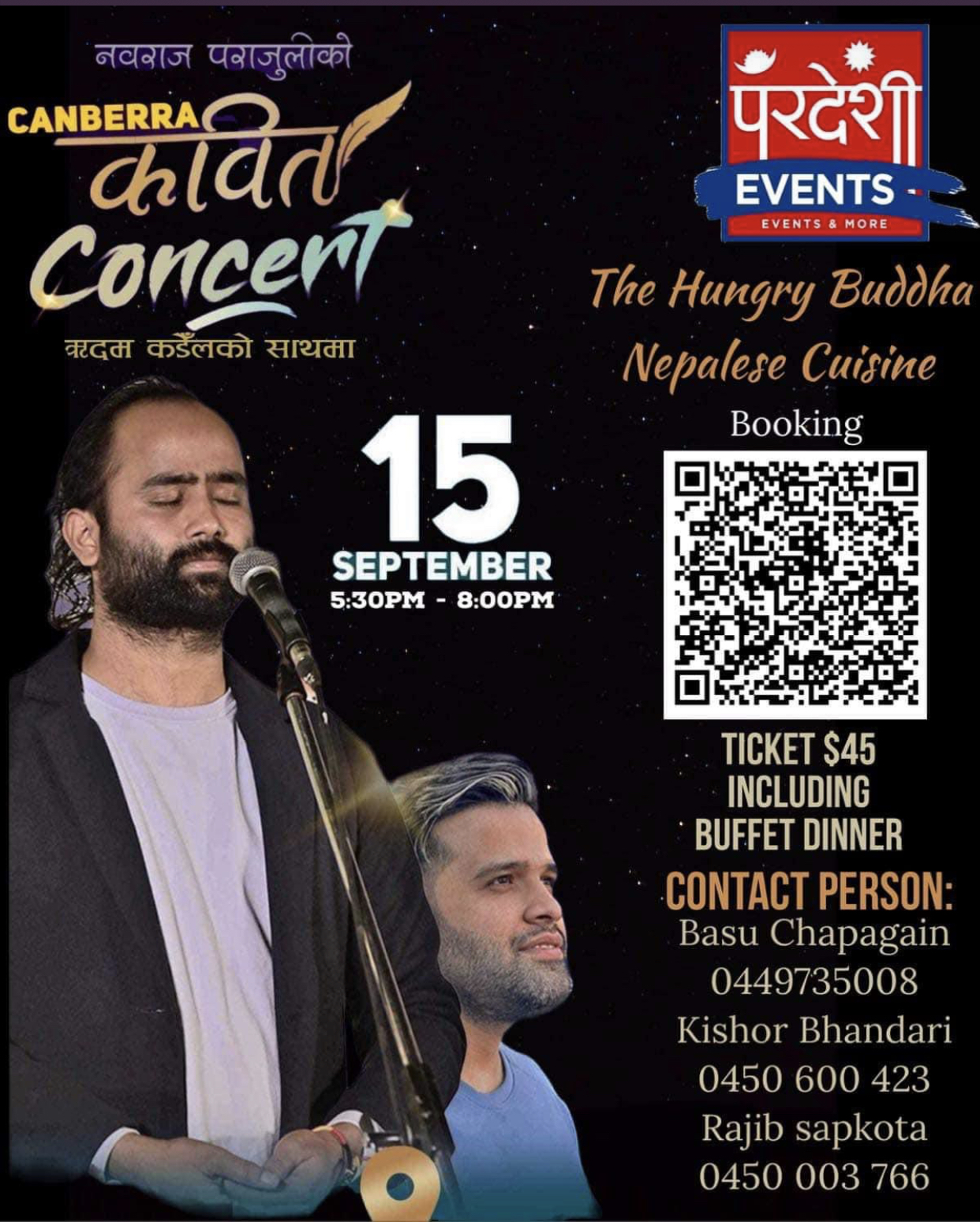 परदेशी इभेन्टको आयोजनामा हुने कविता कन्सर्ट हंग्री बुद्ध नेपाली कुजीन रेष्टुरेन्टमा हुने इभेन्टका किशोर भण्डारीले बताए ।